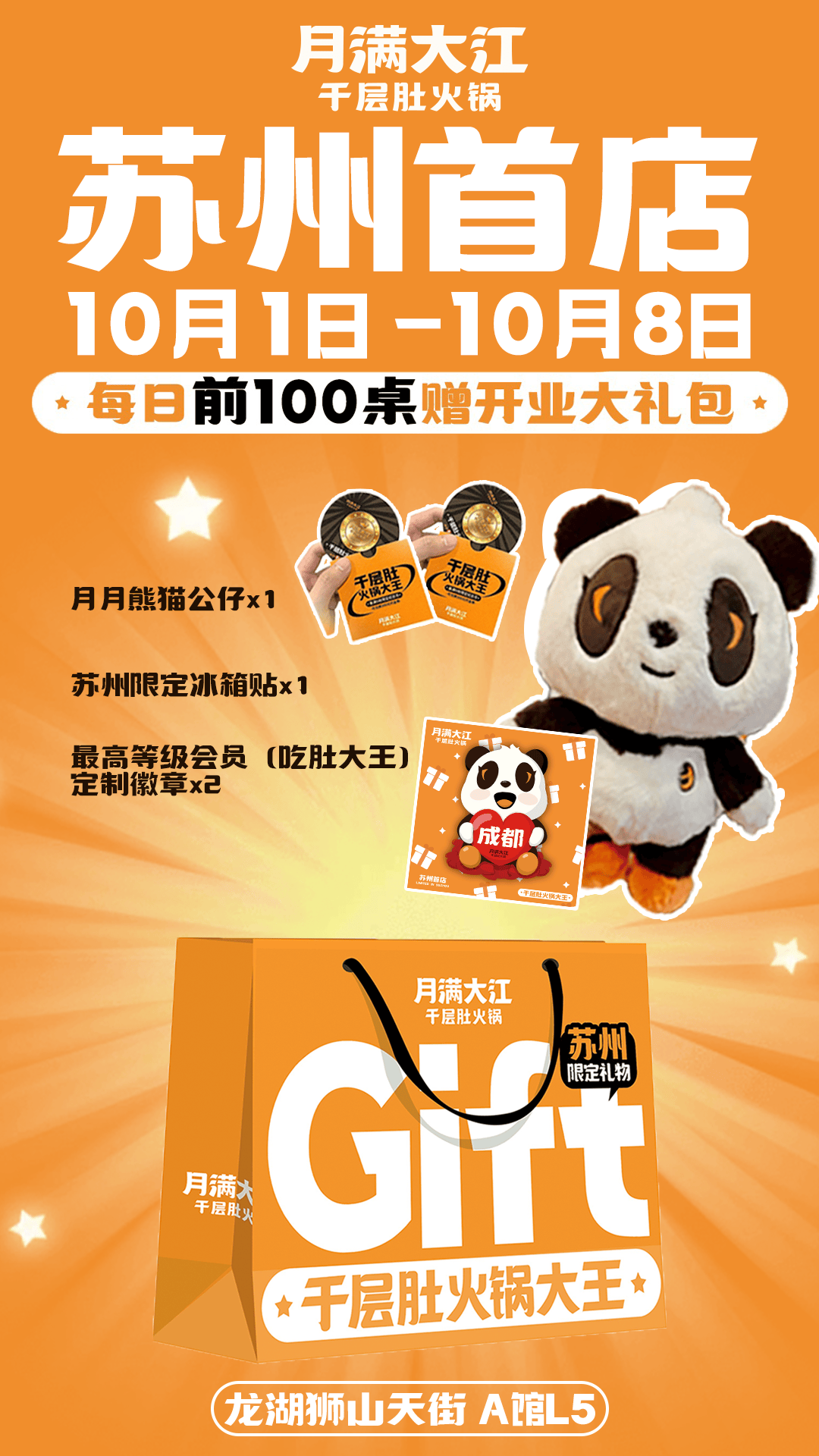 还未开业,粉丝数已达到5000人左右,火爆程度超乎想象,粉丝纷纷留言表示期待;为感恩苏州客户,9月27日—10月8日狮山店精心准备了开业限定大礼包,每天前100桌到店消费客户免费赠送,内含熊猫月月IP 公仔、熊猫爱心城市冰箱贴、最高会员等级吃肚大王限定徽章 。
