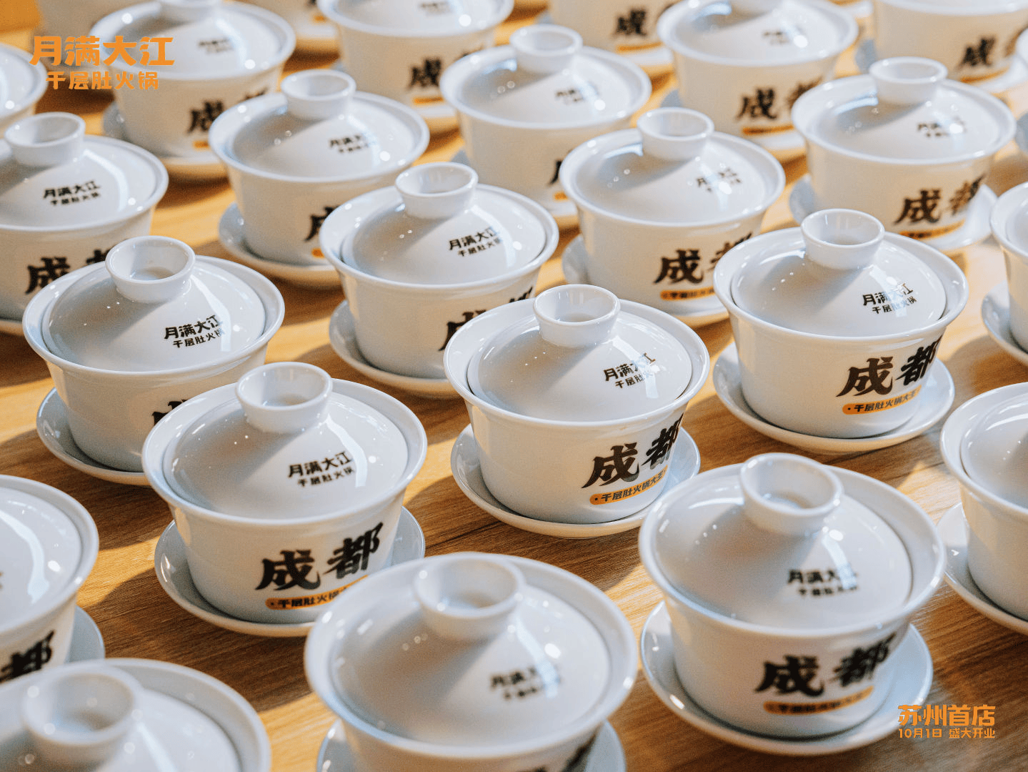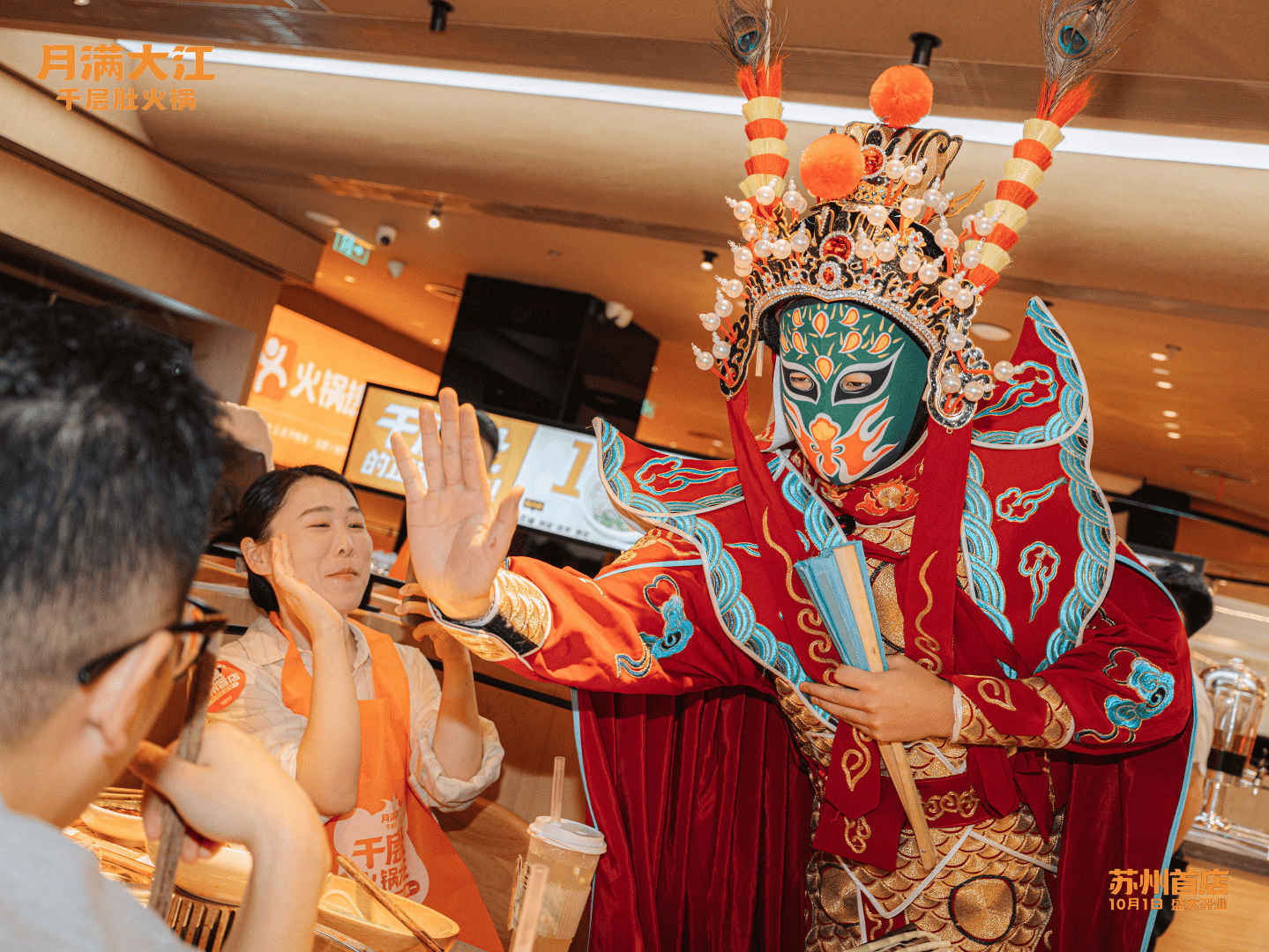 月满大江苏州首店落户于苏州高新区人气核心商圈“龙湖狮山天街”5楼,门店空间装修现代简约大气,以品牌色活力橙为基调,突显时尚年轻活力;将品牌特色与成都元素巧妙融合,“盖碗茶”、“ 川剧变脸”是消费者沉浸式体验成都文化与美食的邂逅之旅。